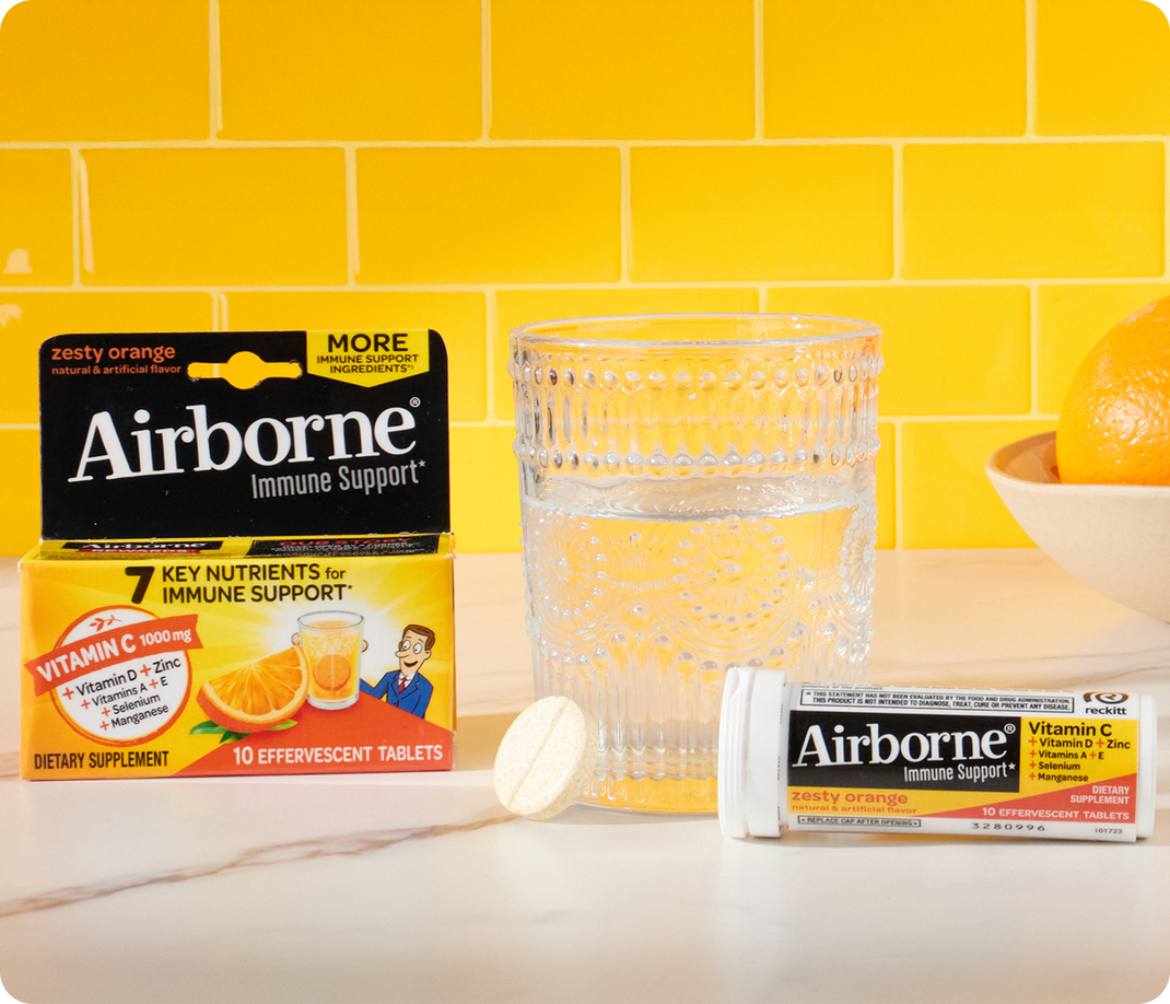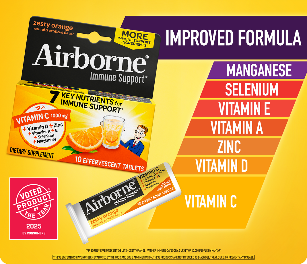 At Airborne, we believe every moment deserves your best self. That’s why our most complete immune support formula yet was created to support your everyday well-being. Whether you prefer Effervescent or Chewable tablets, take on your day with a daily serving of 7 powerful ingredients: vitamin C, vitamin D, Zinc, vitamin A, vitamin E, Selenium and Manganese.*